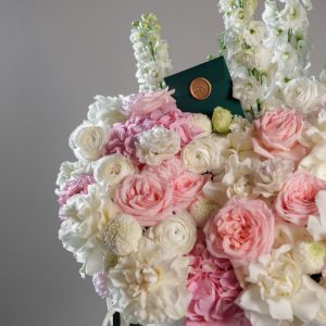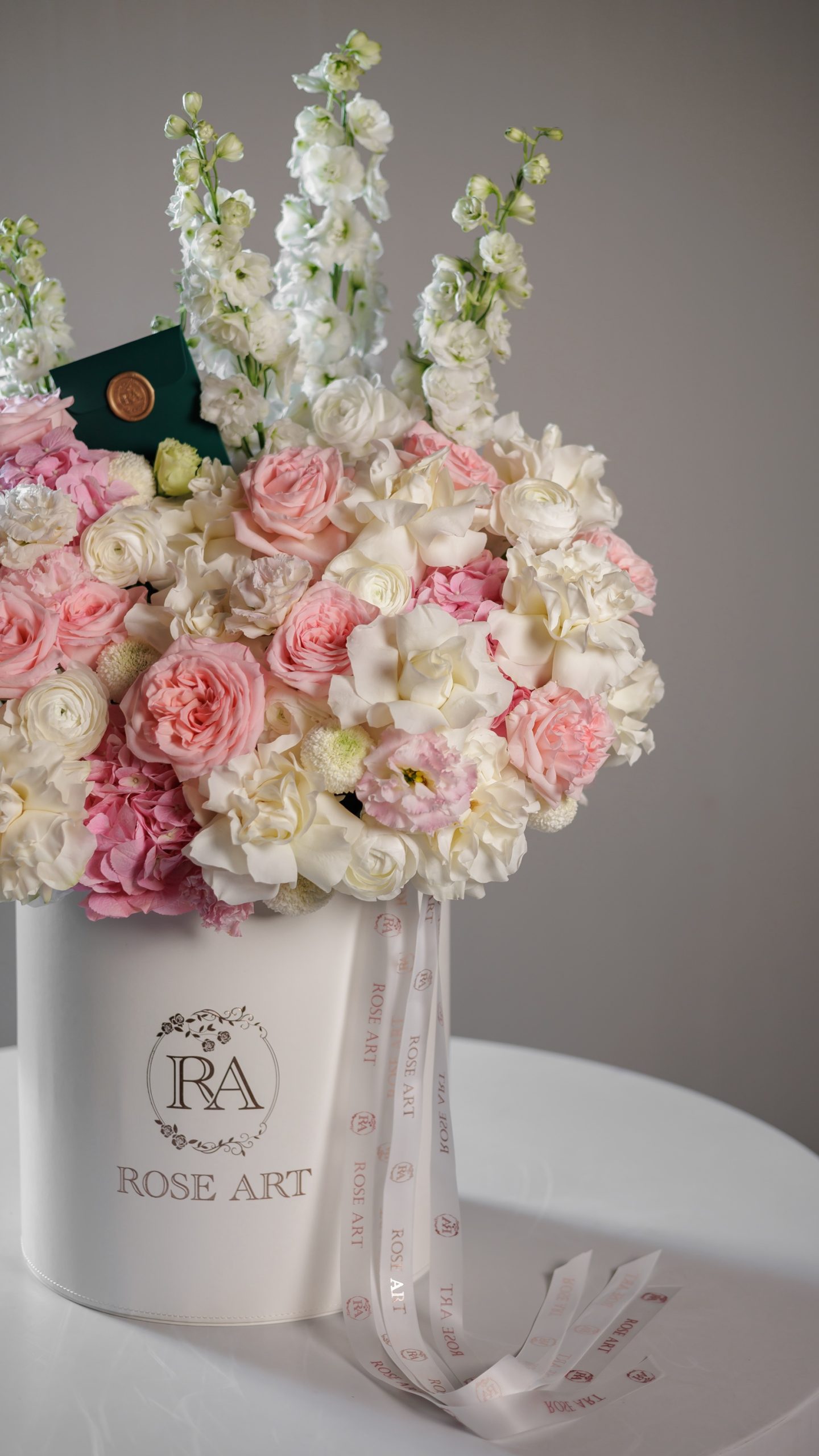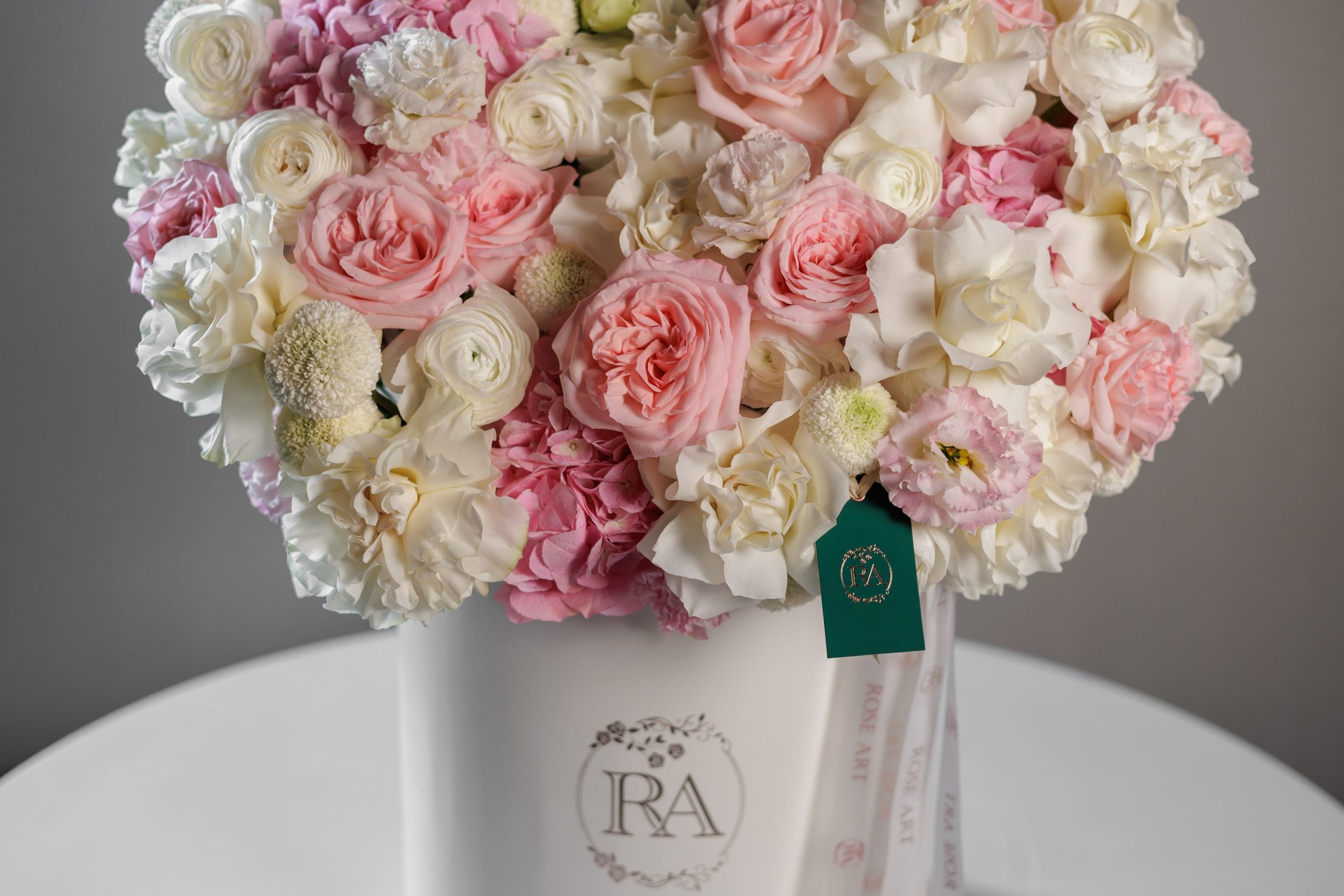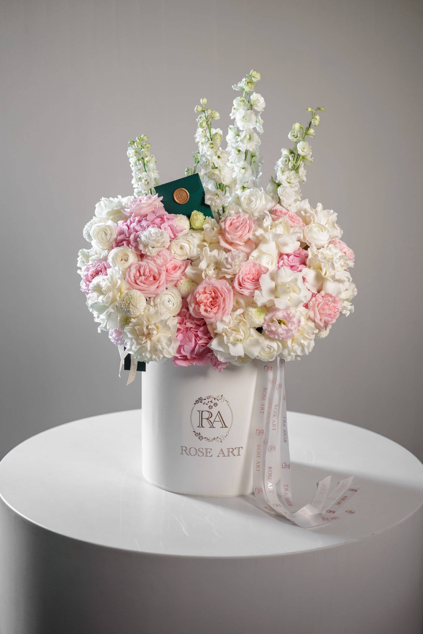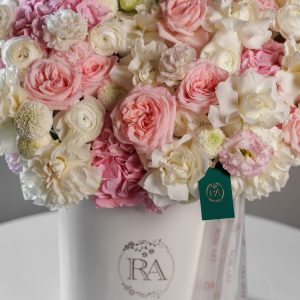This elegant arrangement is a luxury floral hatbox design that blends softness with refined structure. Styled in a classic white Rose Art box, it feels timeless, graceful, and impeccably polished.