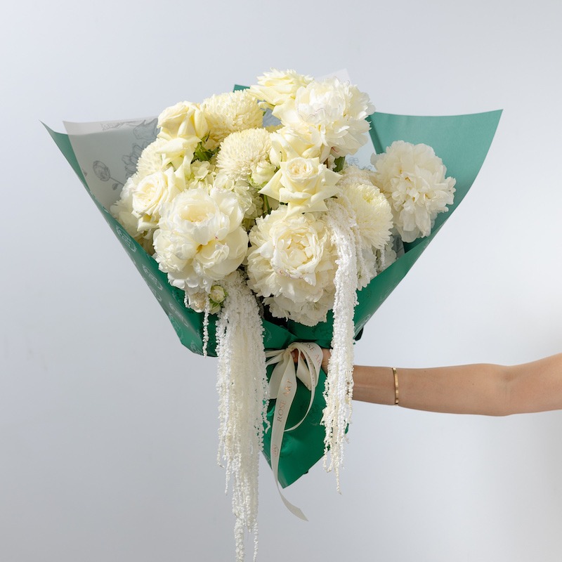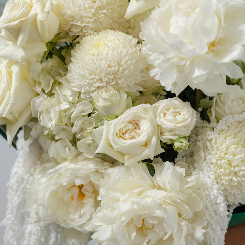 Откройте для себя элегантность простоты с нашим букетом «Art of White» — роскошным и изящным выбором для торжеств вне времени. Эта белоснежная композиция включает в себя великолепное сочетание свежих ослепительно-белых пионов, нежных хризантем и классических армянских роз.