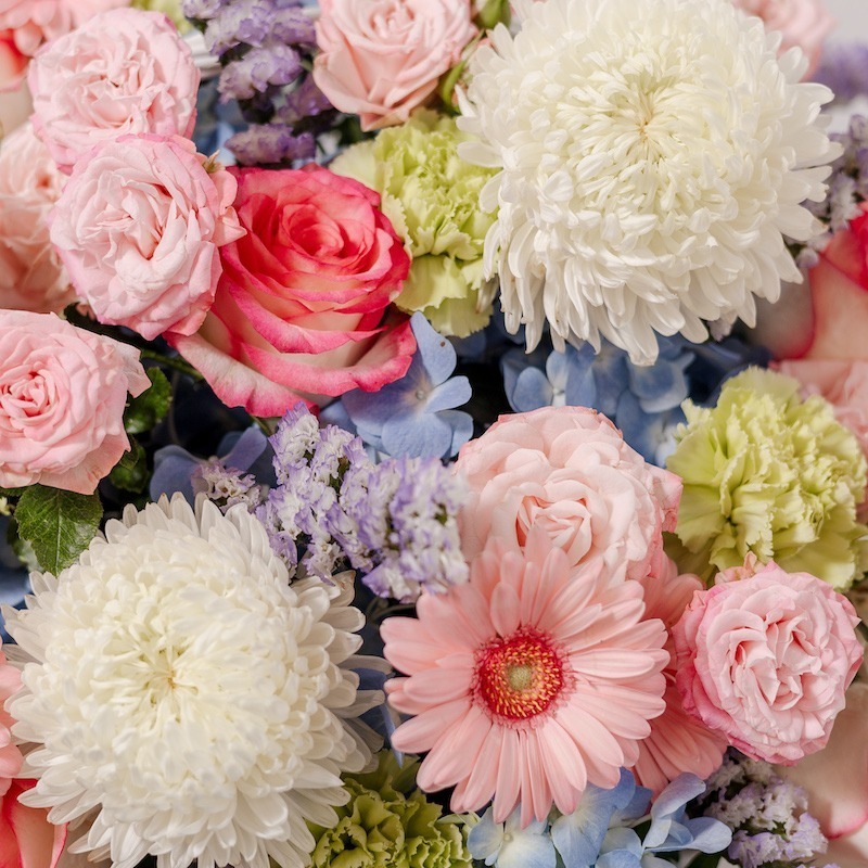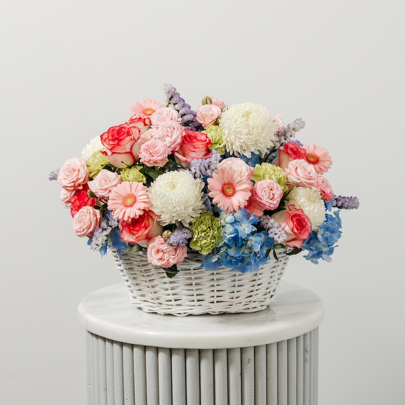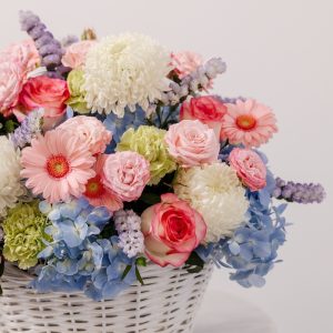 Симфония красок, от которой захватывает дух. Наша корзина «Cotton Candy» (Сахарная вата) — это радостная и игривая композиция, напоминающая вазу с яркими сладостями. Этот очаровательный микс включает восхитительное сочетание свежих голубых гортензий, роскошных белых пионов и жизнерадостных розовых гербер.